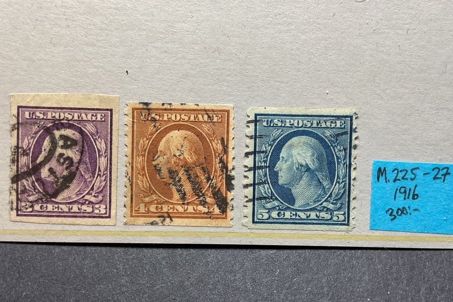 Fint skurna ex av stämplade frimärken M.225-227 1916 (300:-)