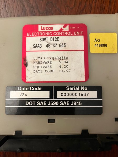 Elektronisk styrenhet från Lucas, modell 30VT DICE. Artikelnummer SAAB 45 37 643. Lucas artikelnummer 52010376A. Står Saab 9-5 98 på. Från fyndlåda funktion osäker