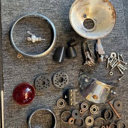 Vet ej vad allt kommer ifrån. Men blinkers satt på kriedler och mustang (ulo), sen är det ett magura reglage och ett fäste för magura choke. Bottengummi med lampfäste till större mopedbaklyse, bromskontakt i fint skick, några reflexer. Lampinsats compakt tror jag. Lite motor delar, en Bosch tändplatta, Sachs original fett. En väldigt kort men komplett vajer av nåt slag.