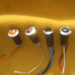 Fyra kontrollampor (röd, blå, grön, orange) från en äldre SAAB, men som passar alla märken. Tyvärr inga glödlampor i, men det fixar du ju lätt.