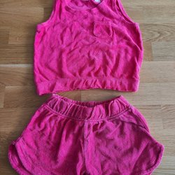 Ett set med ett linne och ett par leggings. Båda i samma ljusrosa nyans och vikta.