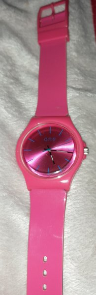 One klocka med ett rosa silikonarmband och ett rosa urtavla. Klockan har ett kvartsurverk.