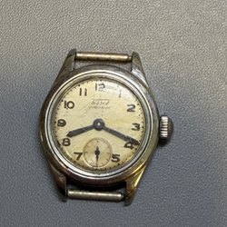 Klockan har en vacker urtavla och ett fint bearbetat armband och följer tiden när man dra upp den.