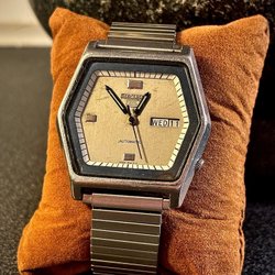 Seiko 5 automatisk herrklocka med boett och armband i rostfritt stål. Klockan har en svart urtavla med dag- och datumvisning. Boetten är märkt ”WATER RESISTANT” och ”STAINLESS STEEL 7009-4040”. Armbandet har en viklås med Seiko-logotyp. Se bilder för skick, tickar på som den ska. Lycka till!