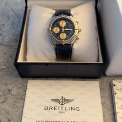 En snygg Breitling. Boetten mäter 43 mm i diameter. Normalt åldersslitage på ur/läder. Med klockan kommer även en länk liknande pilotlänken fast "no name". Slitet original läderband sitter monterat. Se bilder som en del av klockans beskrivning. Gångkontrollerad samt trycktestad av Urbrev i mars 2026 med godkänt resultat.