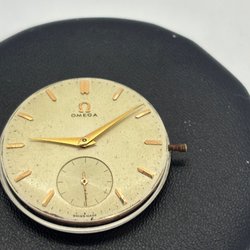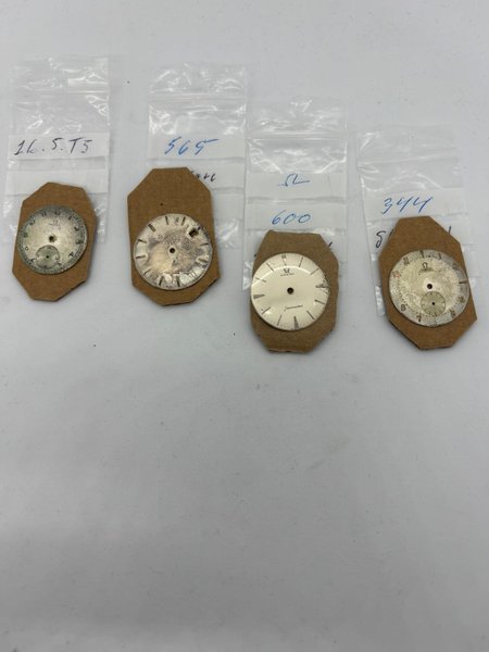 Four Omega watch dials are available. One is an Omega Seamaster dial. The dials are in used condition and show signs of wear and age. These are suitable for repair or restoration projects.