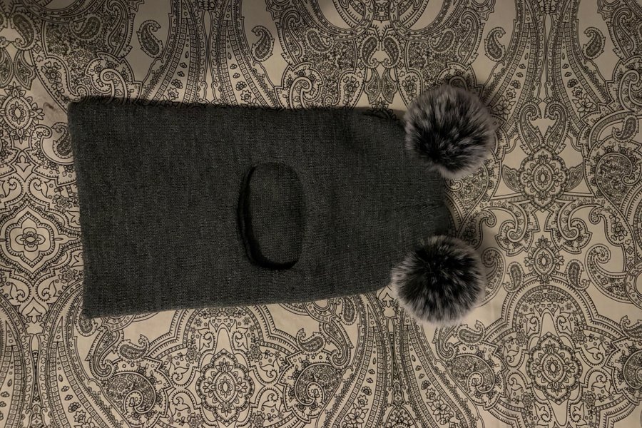 Mörkgrå balaklava med två fluffiga pom-poms upptill. Balaklavan har en öppning för ansiktet.