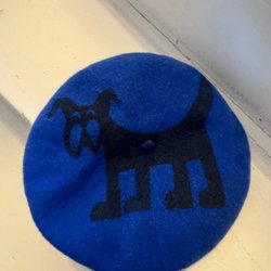 En handgjord virkad basker i färgerna svart, turkos, grå och lila.