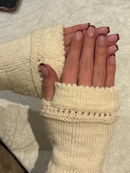 Ett par handledsvärmare i en ljus, enfärgad nyans. De har en ribbad mudd upptill och nedtill, med ett dekorativt hålmönster längs kanten. Designen är fingerlös, vilket ger flexibilitet.