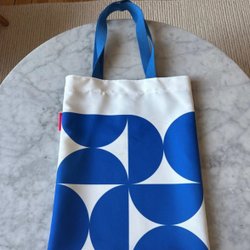 Vit tygväska med texten "boy mama" tryckt på framsidan. Texten "boy" är skriven i kursiv stil ovanför "MAMA" som är tryckt med stora bokstäver fyllda med ett blått blommönster. Väskan hänger på en trägalge.