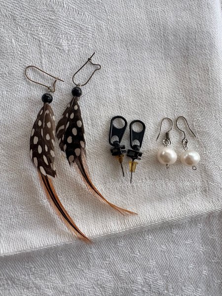 Tre par örhängen i olika stilar och material. Ett par med fjädrar, ett par med pärlor och ett par med dragkedjor.