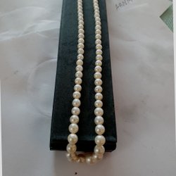 Ett elegant pärlhalsband med varierande pärlstorlekar, från mindre pärlor nära låset till större pärlor i mitten. Låset är dekorerat med små stenar. En pärla med defekt, se bilderna.