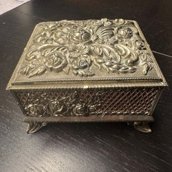 Ett smyckeskrin dekorerat med band och spets.