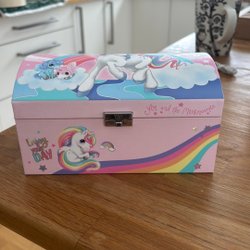 Ett litet smyckeskrin i trä med texten ”Bethlehem” ingraverad på locket. Skrinet har ett rött tyg på insidan och ett spänne i metall.