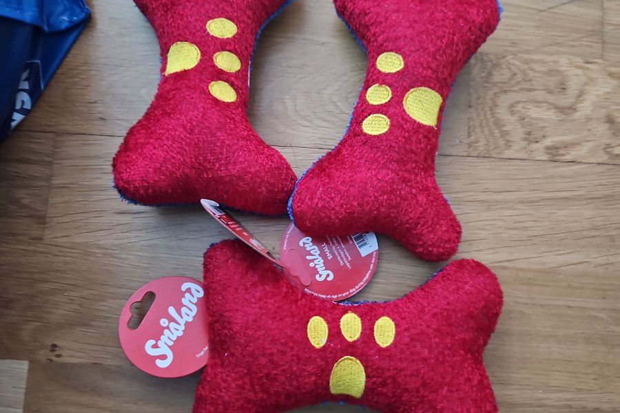 Tre hundleksaker från Småland. Leksakerna är formade som ben och har en mjuk yta. De är röda med gula prickar och har en blå undersida.