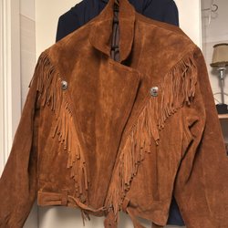 Ett par chaps i brunt utförande med fransar längs benen. De har ett justerbart bälte upptill och fästs med spännen och dragkedja. Hög kvalitet och obetydligt använda.