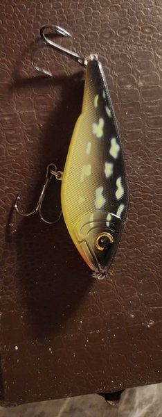 Detta fiskedrag har en svart och gul design med detaljer i vitt. Utrustat med två krokar för effektiv fiske. Passar för olika typer av fiske.