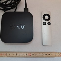 Apple TV med fjärrkontroll och sladd