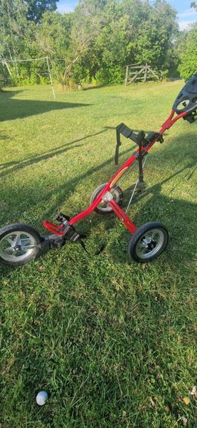 En golfvagn i rött utförande. Perfekt för golfrundan. Paraply och paraplyhållare med följer