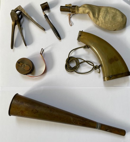 Diverse gamla jaktprylar som kruthorn, krutflaska, jakthorn m m.