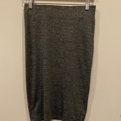 Denne nederdel er i en mørkegrå farve med en sort linning. Den har rynkede detaljer i siderne, som giver en flatterende pasform. Nederdelen er knælang og har et afslappet, men stilrent udtryk.