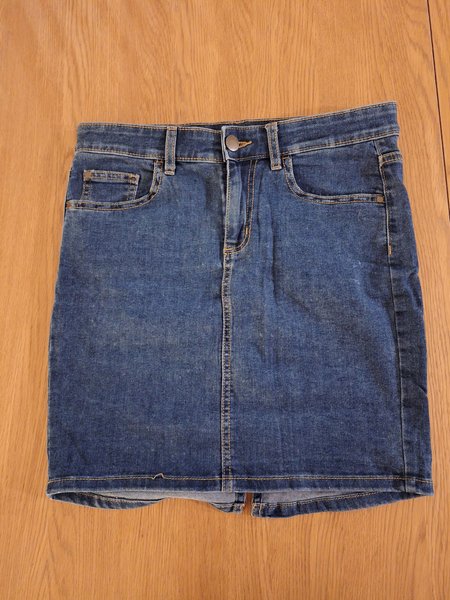 Denimkjol med fem fickor och dragkedja framtill. Kjolen har bälteshällor och en slits baktill för ökad rörlighet.