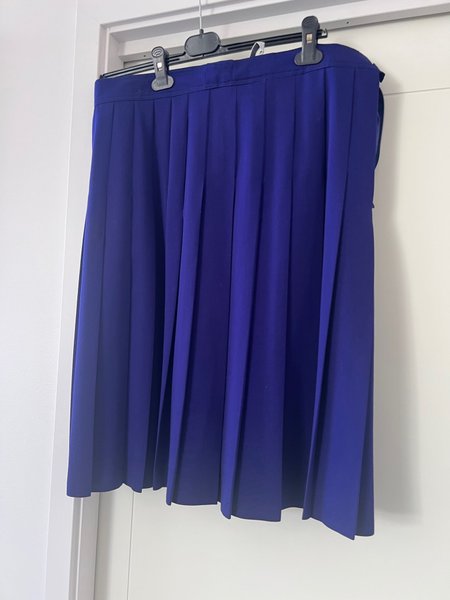 En plisserad kjol i en djup blå nyans. Kjolen har veck över hela tyget, vilket ger den en fin volym och rörelse. Den är designad med en slät linning och en dold dragkedja i sidan för en smidig passform. Kjolen slutar strax ovanför knäna och har en klassisk, tidlös design som passar för många olika tillfällen.