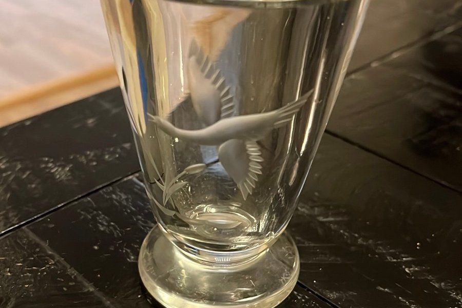 Detta är en kristallvas med en etsad svan- eller andliknande fågel och vassrör