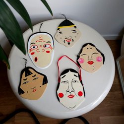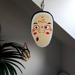 En vacker tavla med asiatiskt motiv. Den har en detaljerad illustration av en man med en stav, omgiven av blommande grenar och traditionella tecken.