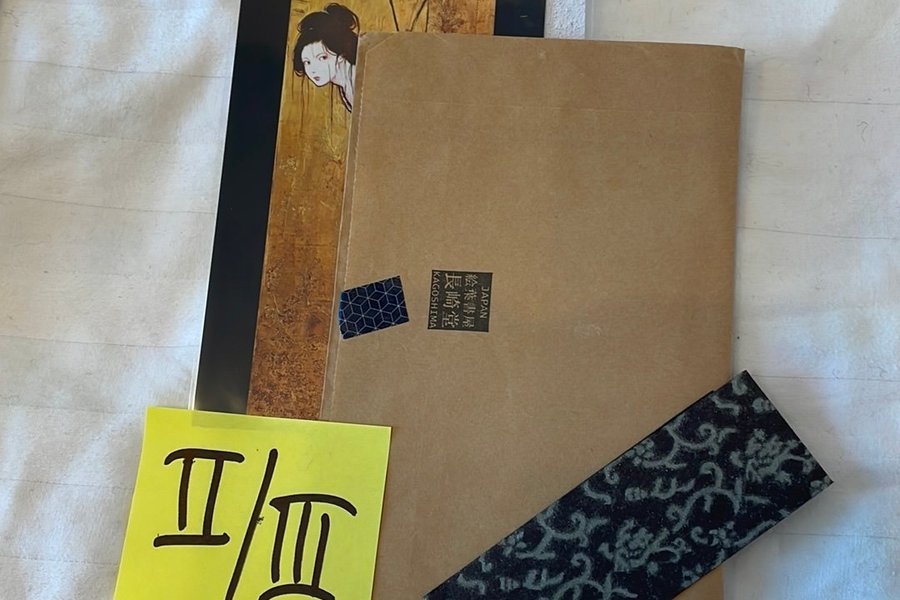 Två japanska konstreproduktioner i format 10x15 cm och tillhörande kuvert med japansk stämpel.
