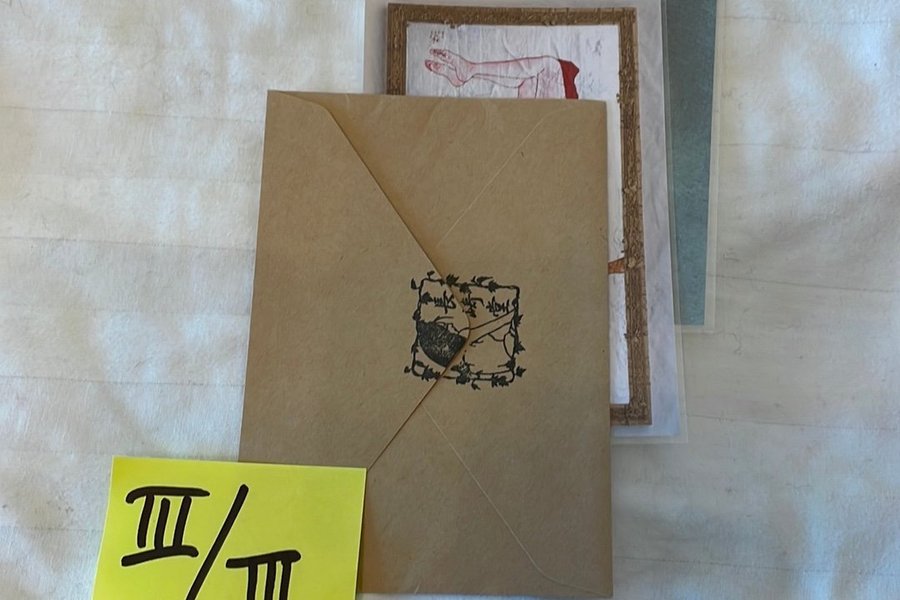 Två japanska konstreproduktioner i format 10x15 cm och tillhörande kuvert med japansk stämpel.