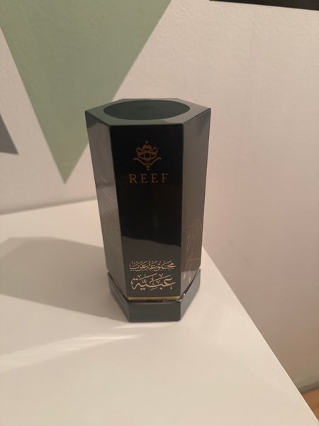 Reef parfume i en mørk flakon med gulddetaljer. Flakonen har et ottekantet design og er dekoreret med arabisk kalligrafi og et hestemotiv.