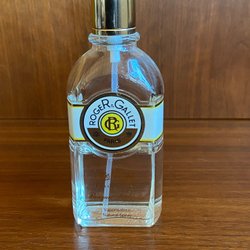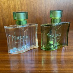 Tre Fabergé Brut parfymflaskor i grön glas. Flaskorna har silverfärgade korkar och svarta etiketter med texten "FABERGÉ" i silver. Flaskorna är i olika storlekar.