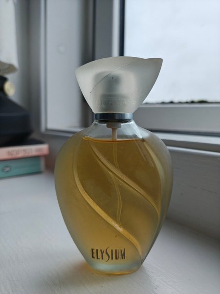 Clarins Elysium parfume i en elegant flaske. Flasken har et unikt design med snoede riller og teksten "ELYSIUM" præget på fronten. Toppen af flasken er frostet med "CLARINS" indgraveret.
