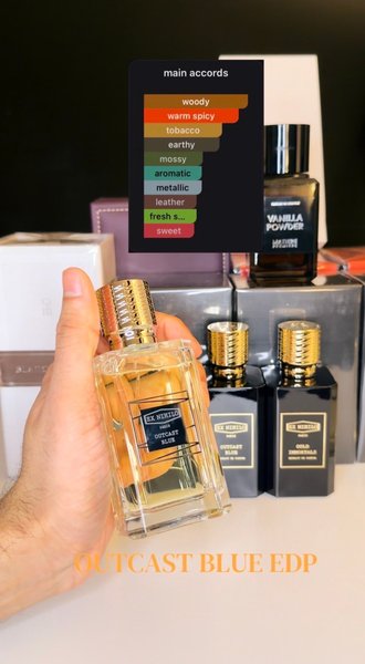 Ex Nihilo Outcast Blue Eau de Parfum. Duften har noter af træ, varm krydderi, tobak, jord, mos, aromatiske noter, metalliske noter, læder, friskhed og sødme.