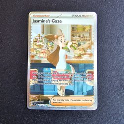 Säljer ett Pokémonkort av typen Supporter med namnet Jasmine's Gaze. Kortet är från serien Trainer.