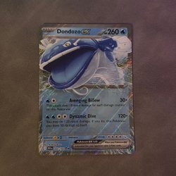 Dette er et Dondozo EX Pokémonkort med angrebene Avenging Billow og Dynamic Dive. Kortet har 260 HP og følger Pokémon EX-reglerne.