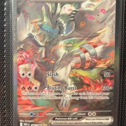 Säljer ett Pokémonkort av typen Reshiram EX. Kortet har attackerna Slash och Blazing Burst.