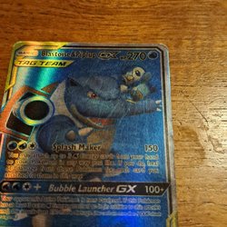 Säljer ett Pokémonkort av typen Blastoise & Piplup GX. Kortet är ett TAG TEAM-kort med attacker som Splash Maker och Bubble Launcher GX.
