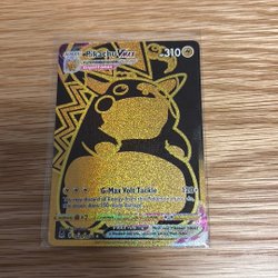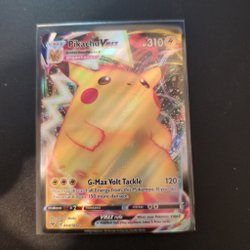 Ett Pikachu VMAX Pokémonkort. Kortet har attacken G-Max Volt Tackle.