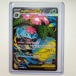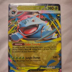Säljer ett Pokémonkort av Mega Venusaur EX. Kortet har förmågan Solar Transfer och attacken Jungle Dump. Se bilder för detaljer.