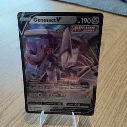 Säljer ett Pokémonkort av typen Genesect V. Kortet har förmågan Fusion Strike System och attacken Techno Blast.