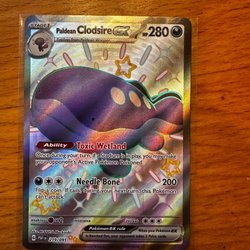 Säljer ett Pokémonkort av Paldean Clodsire ex. Kortet är av typen Stage 1 och har 280 HP. Den har attackerna Poison Ring och Giga Impact.