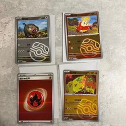 Pokemonkort med olika karaktärer och attacker.