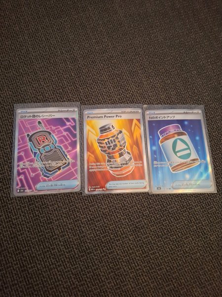 N's PP UP från det japanska settet mega dream som är från 2025, Team Rocket's Transceiver från mega dream också och tillsist en Premium Power Pro som är från Ascended Heroes som är från 2026.