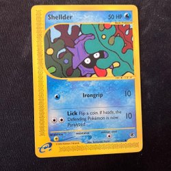 Säljer ett Shellder Pokémonkort, numrerat 129/165. Kortet är från 2002.