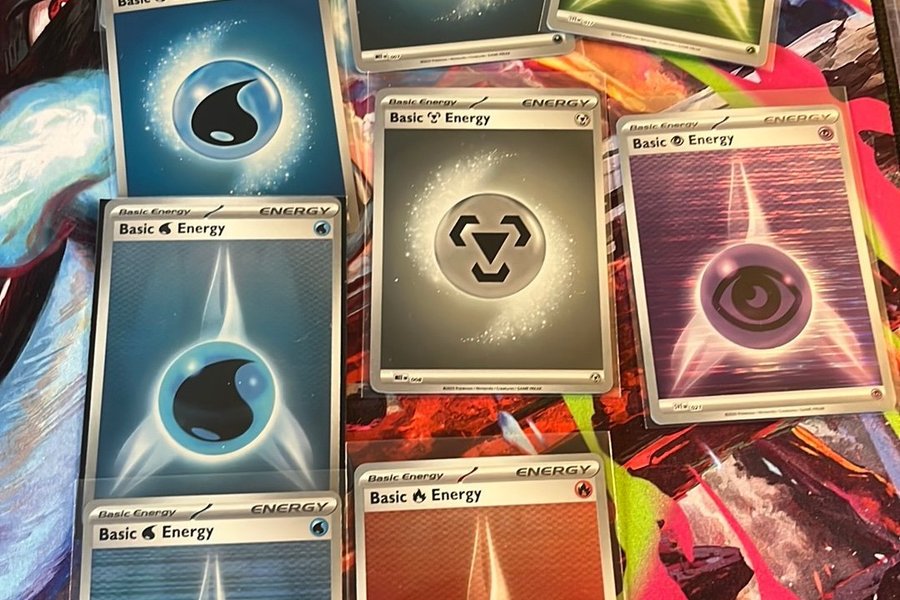 Ett set med Pokémon Basic Energy-kort. Korten är av typen Basic Energy och har olika energisymboler.