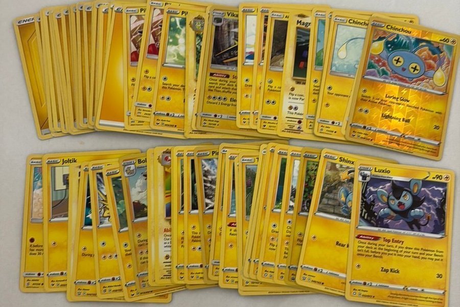 Ett parti med Pokemonkort, inklusive karaktärer som Chinchou, Luxio och Joltik.