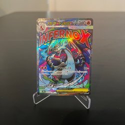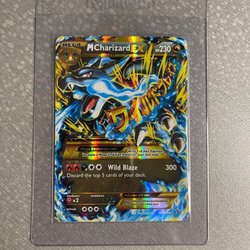 Pokemonkort föreställande Mega M Charizard EX. Kortet är guldfärgat med blå och svarta detaljer. Texten ”MEGA M Charizard EX” och ”HP 230” finns i övre högra hörnet. Kortet har en attack som heter ”Wild Blaze” med 300 skada. Kortet är av typen EX.