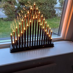 Vit adventsljusstake med sju ljus. Märkt med ING INDUSTRIAL LIMITED, SW-21, 7 x 3W/34V E10. Liteavskavd färg på ett ställe - se bild. Glödlampor behöver kollas och bytas